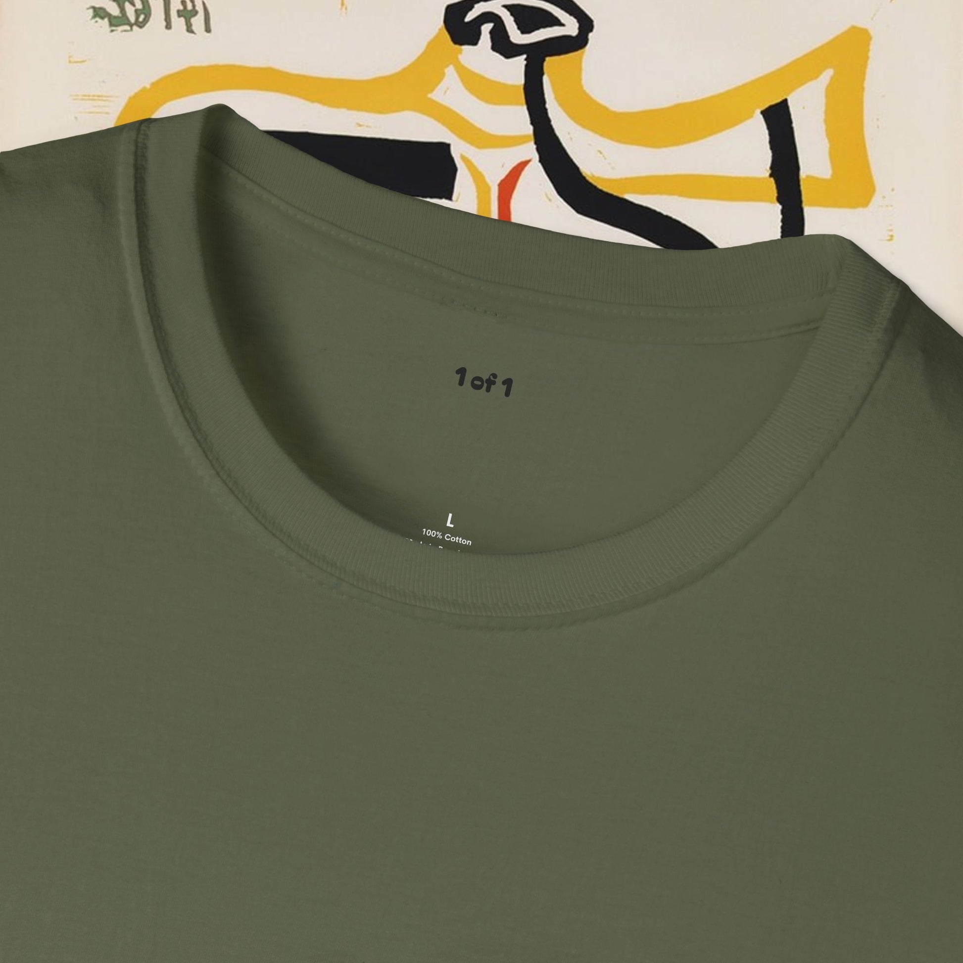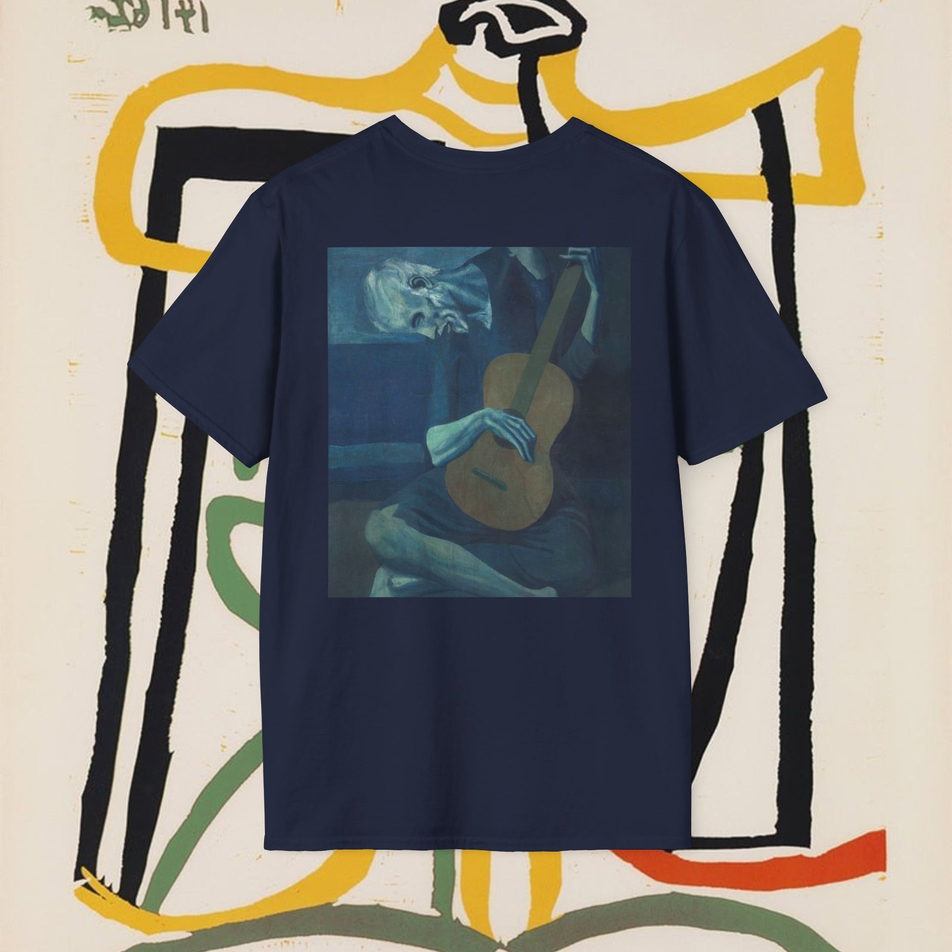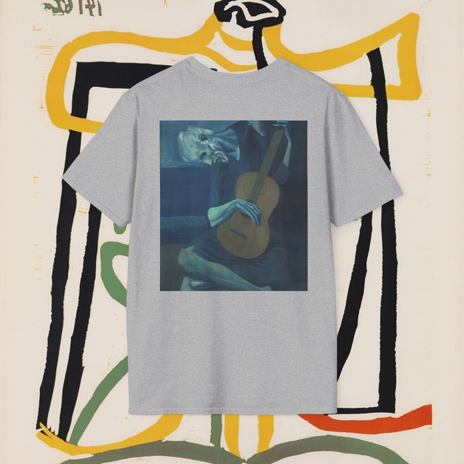 This tee feels like a quiet evening at a neighborhood coffeehouse — a little raw, a little soulful. The front shows a bold, mixed-script emblem that catches the eye without shouting. On the back, a muted, painterly portrait of a guitarist sits inside a square, like a vinyl cover pinned to your shirt. Light heather fabric and a classic crew cut keep the look effortless. Wear it to open-mic nights, late-night record digs, or when you want your outfit to hint at stories without explaining them.